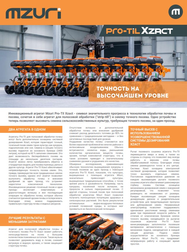 Каждая высевающая секция оснащена дозирующим диском и разделительным устройством для предотвращения пропуска или дублирования семян. Независимый электропривод позволяет поддерживать одинаковое расстояние между семенами даже при переменной скорости работы. В отличие от классических бункеров сеялок точного высева, находящиеся на рычагах сошников агрегатов Pro-Til XZACT мини-резервуары заполняются посевным материалом автоматически с помощью механизма подачи, находящегося в каждой секции дозатора. Подача семян осуществляется из основного бункера агрегата MZURI, что продлевает непрерывную работу и сокращает время простоя.